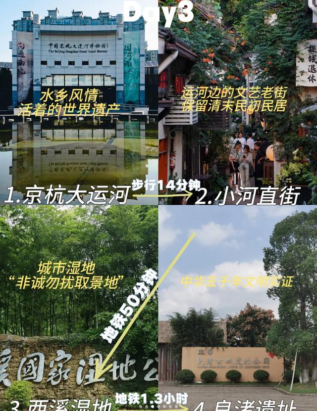 第三天:游览京杭大运河、小河直街、西溪湿地和良渚古城,感受别样的水乡之美。