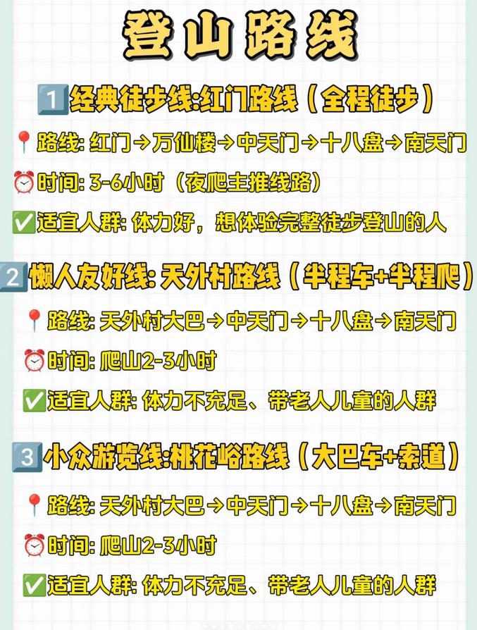 💰门票及费用 ①景区门票: 115元(学生票57元) ②索道票(单程) 中天门—南天门: 100元/人 桃花峪—南天门: 100元/人 ③景区大巴(单程) 天外村—中天门: 35元/人 桃花峪—桃花源: 35元/人