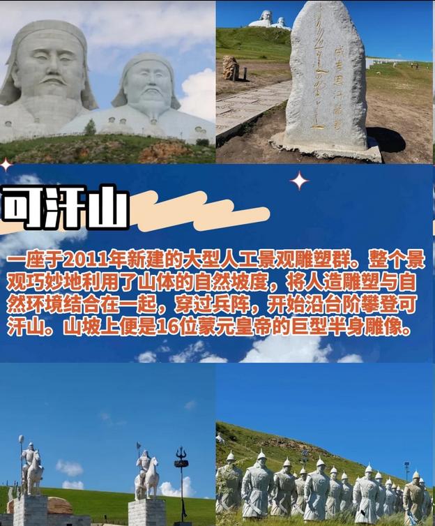 攀登这座历史悠久的山峰,体验成吉思汗的遗迹,登顶后可俯瞰整个草原的壮丽景色!最佳拍摄时间为日落时分,随手拍摄即可获得美丽的照片。建议穿着防滑鞋,因陡峭的坡道较多。