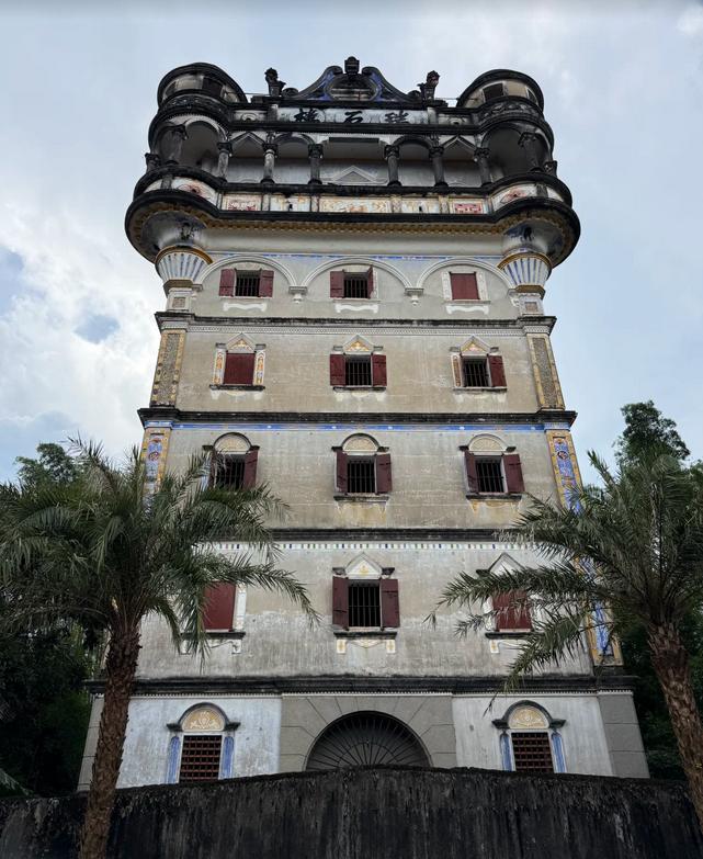 瑞石楼位于锦江里,是开平所有碉楼中规模最大、建筑最为精美的一座,建于1923年,楼高九层,采用钢筋混凝土结构。每层的建筑风格各具特色,既有传统的中国花瓣纹饰,也有巴洛克风格的图案;同时融合了中式设计与罗马、希腊的拱券和廊柱元素。