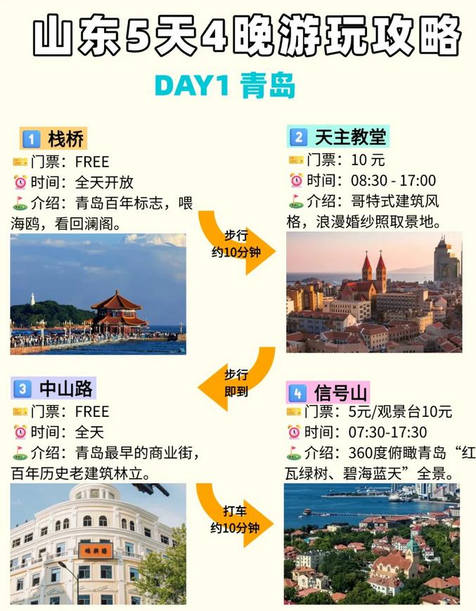 Day1️⃣:抵达青岛 → 栈桥 → 天主教堂 → 中山路 → 信号山(全景俯瞰) → 台东/李村夜市
