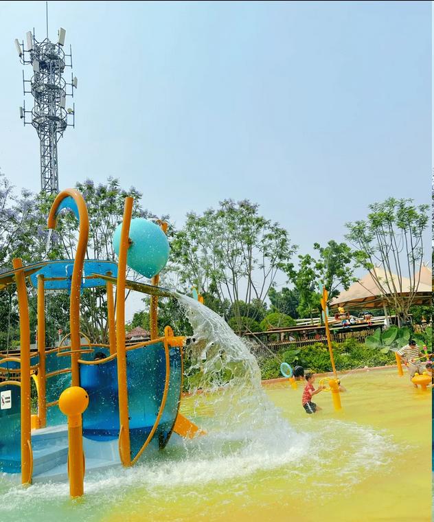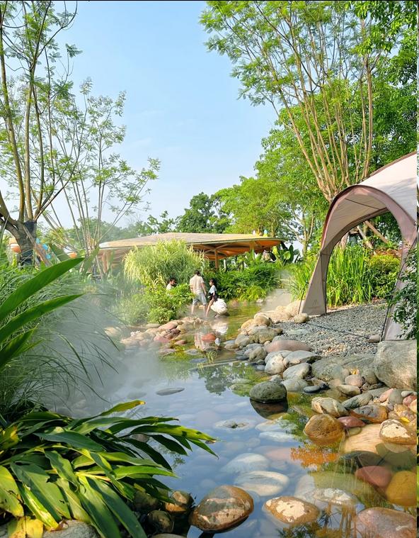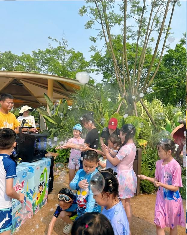 其中一个是泳池(水深仅至成人小腿,非常安全),配备滑梯和喷水枪等游乐设施🛝,另一个区域则模拟了野生小溪,设有石头和一些水上玩具,偶尔还有烟雾和喷雾降温,宛如仙境。