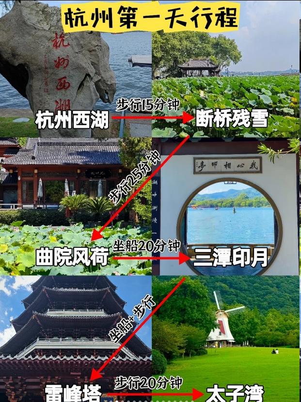 3️⃣杭州西湖面积较大,建议早点前往,通常上午的时间足够游玩,可以选择观光车欣赏,步行可能会耗时较长。