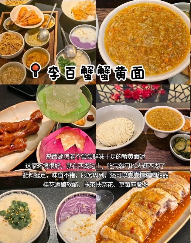 来到西湖,怎能不品尝美味的蟹黄面?这家店环境优雅,紧邻西湖,食材新鲜,另外还有独特的甜品选择(如桂花酒酿软酪、抹茶扶奈花、草莓麻薯冰等)。