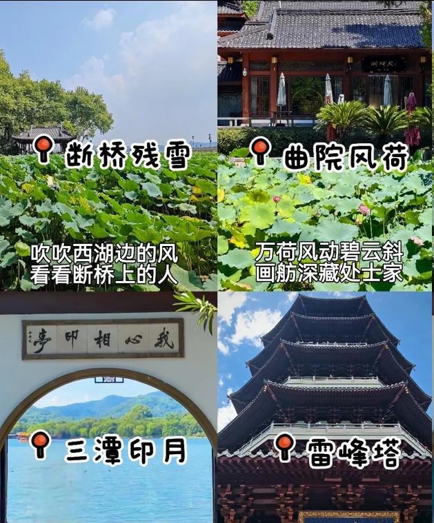 📍西湖经典景点:如断桥残雪、苏堤、白堤、平湖秋月等,晴天拍照极佳,阴雨天也别有一番韵味