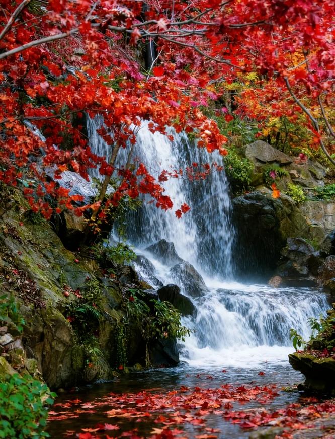 ▫️09:00 入园后乘坐景区交通至栈道入口,首站前往「天心瀑观景台」 木质栈道悬挂在峡谷之上,红枫的倒影映在瀑布下的深潭中,穿上浅色毛衣拍照效果极佳,这里是红叶最为密集的区域之一