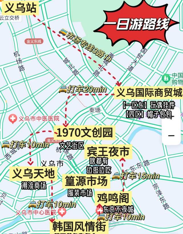 义乌站➡️国际商贸城【一区东】和【四区】➡️1970文创园➡️义乌天地➡️韩国风情街➡️鸡鸣阁➡️宾王夜市