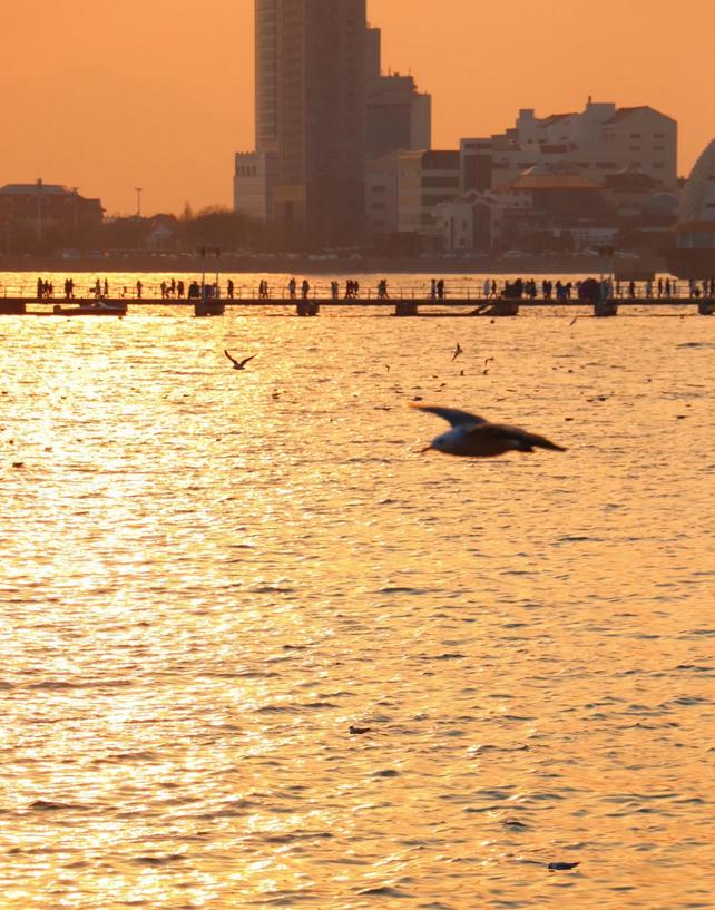 栈桥旁的海鸥在空中翩翩起舞,伸手投喂的那一刻,仿佛把海洋的浪漫握在了手心。沿着海岸悠闲地散步,目睹落日将海面染成金色,远离人潮的宁静与浪漫,正是冬季青岛最令人心醉的享受🌊