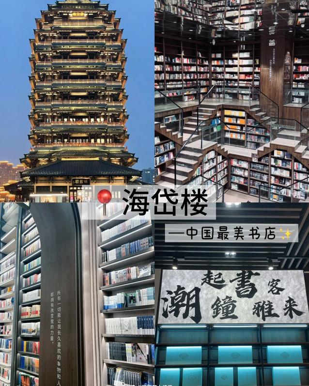 ✅海岱楼钟书阁:一楼有镜面天花板和对称书架,四楼的观景台可以俯瞰湖面,每个角落都适合拍照,晚上的灯光效果十分迷人,绝对不要错过夜景。