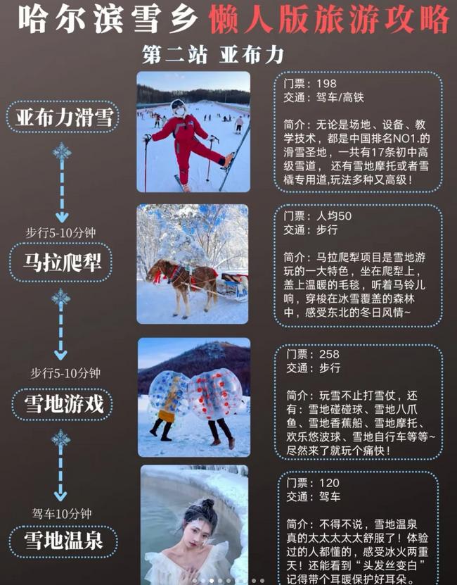 👉当地团:在雪乡和亚布力,丰富的娱乐项目和南北文化差异使得不必忍受零下三四十度的严寒,旅行全程有车接送,包含吃、住、门票和项目等。
