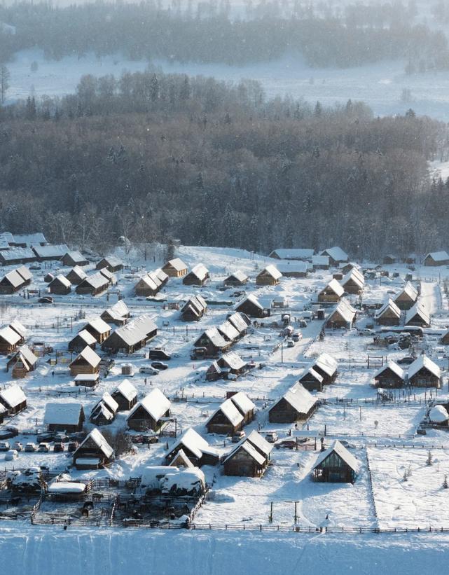 这是村庄最高的观景平台,从这里可以俯瞰整个村落。建议清晨前往,拍摄禾木村的蓝调和日出逆光。当第一缕阳光洒落在村庄时,村民们开始做饭,袅袅升起的炊烟与雪景交相辉映,景色极为迷人。