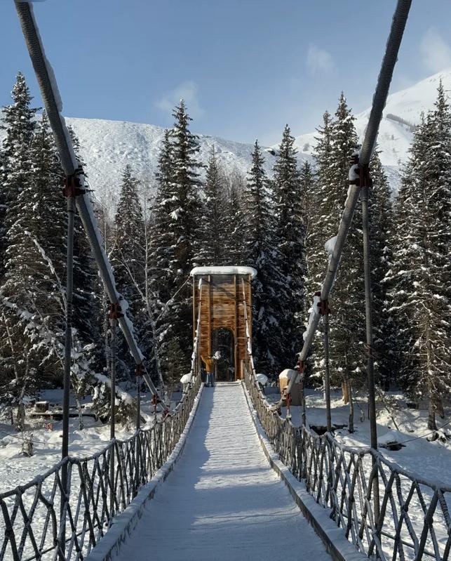 这是一座吊桥,非常适合拍照,你可以在上面与朋友合影,甚至使用无人机拍摄。桥下的河面被冰封,游客可以在那儿拍照和玩耍。