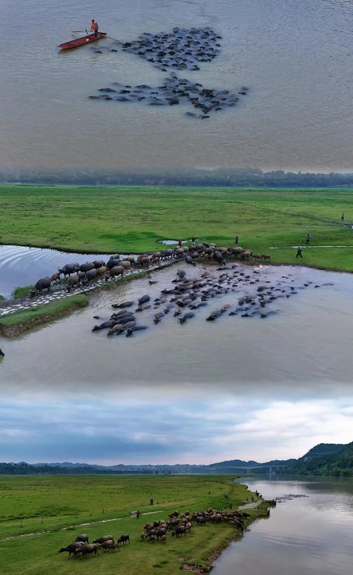 2️⃣百牛渡江:蓬安的独特景观,早在先秦时期,当地的水牛便会在农闲季节渡过嘉陵江,前往月亮岛觅食和休息,待到夕阳西下时再游回家,这一现象被称为“川版动物大迁徙”。