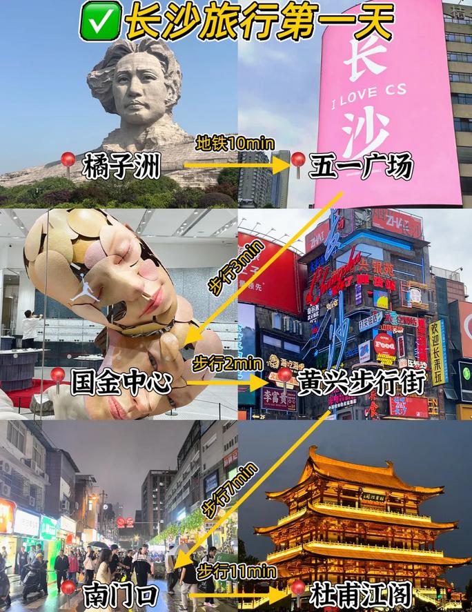 📅第一天:橘子洲→五一广场→国金中心→黄兴步行街→南门口→杜甫江阁