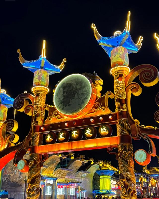 • 主要入口“木兰不夜城”牌坊(红墙金瓦与灯笼相映成趣,极具气势,适合拍照);