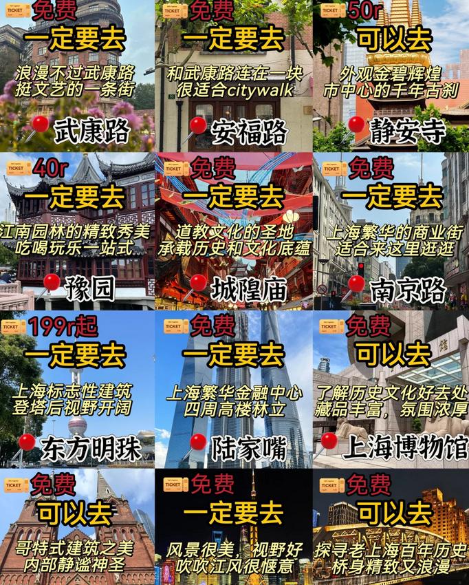 武康大楼→武康路→豫园→城隍庙→陆家嘴→东方明珠→外滩夜景→南京路步行街→上海站