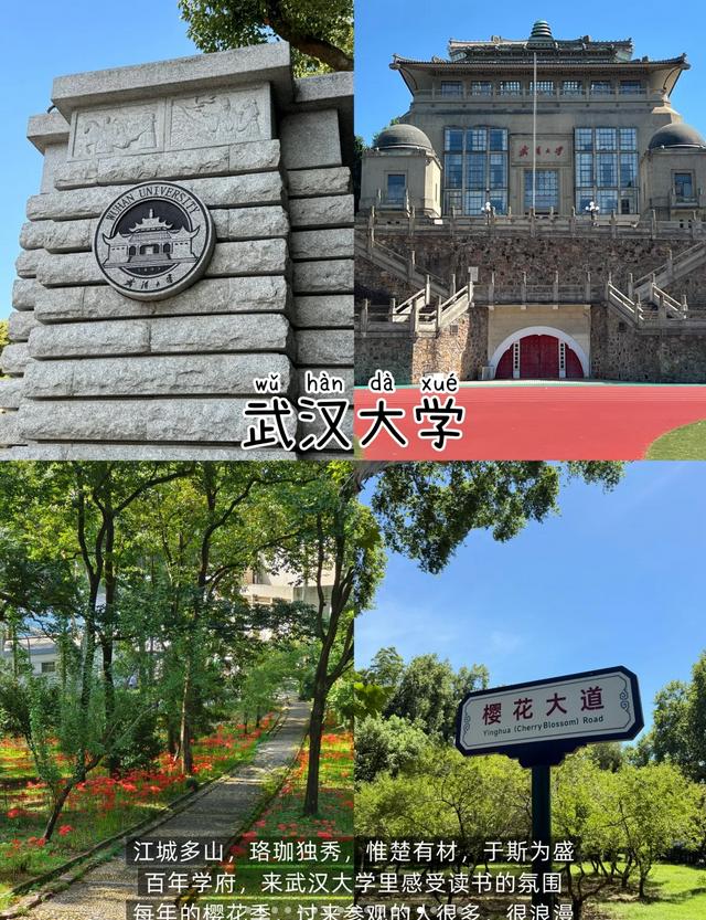 📍武汉大学:这所百年名校让人感受到浓厚的学术氛围,尤其在每年的樱花季,吸引了众多游客前来欣赏。