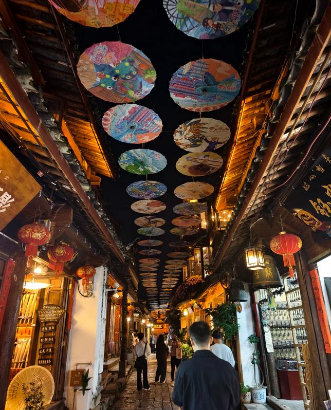 丽江版的《雨巷》!数百把油纸伞悬挂在空中,尽显绚丽