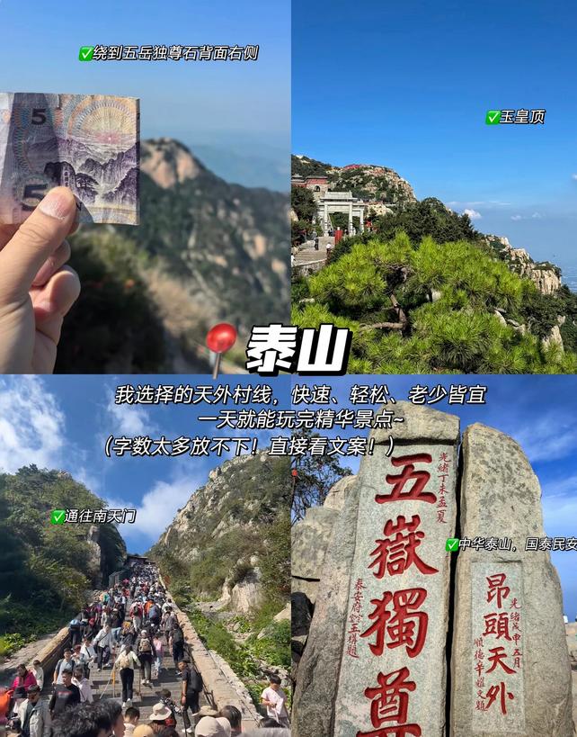 ▪️ 游览顺序:天外村游客中心➡️景区大巴(20分钟)➡️中天门➡️缆车(10分钟)➡️南天门➡️徒步(25分钟)➡️碧霞祠➡️徒步(10分钟)➡️五岳独尊➡️徒步(5分钟)➡️玉皇顶