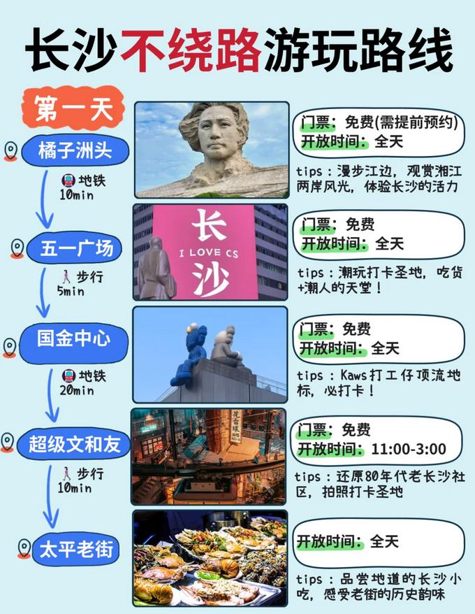 作为一个在长沙出差和游玩多次的gai溜子,我对这里的景点和美食街可谓是了如指掌👀。为了帮助大家更好地规划行程,我熬夜整理了一份攻略,希望能让你们在周末的两天一晚中轻松游玩长沙,避免走冤枉路📢📢📢