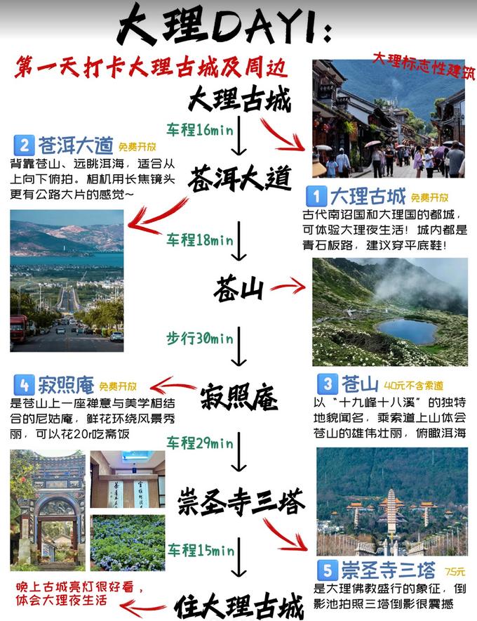 ✅第一天:游览大理古城及周边 首先到大理古城→接着去苍洱大道→然后前往苍山→再到寂照庵→崇圣寺三塔→最后入住大理古城(晚上古城灯光璀璨,体验大理的夜生活) ✅