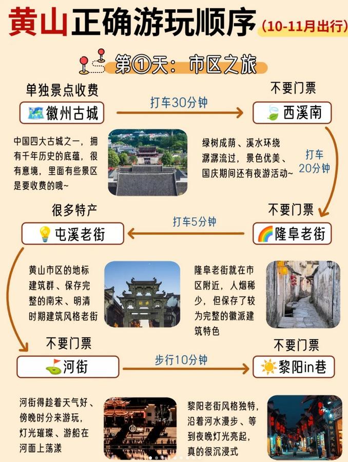 💡黄山市区:屯溪老街和黎阳老街热闹非凡,交通十分方便,打车前往机场大约需要20分钟左右。