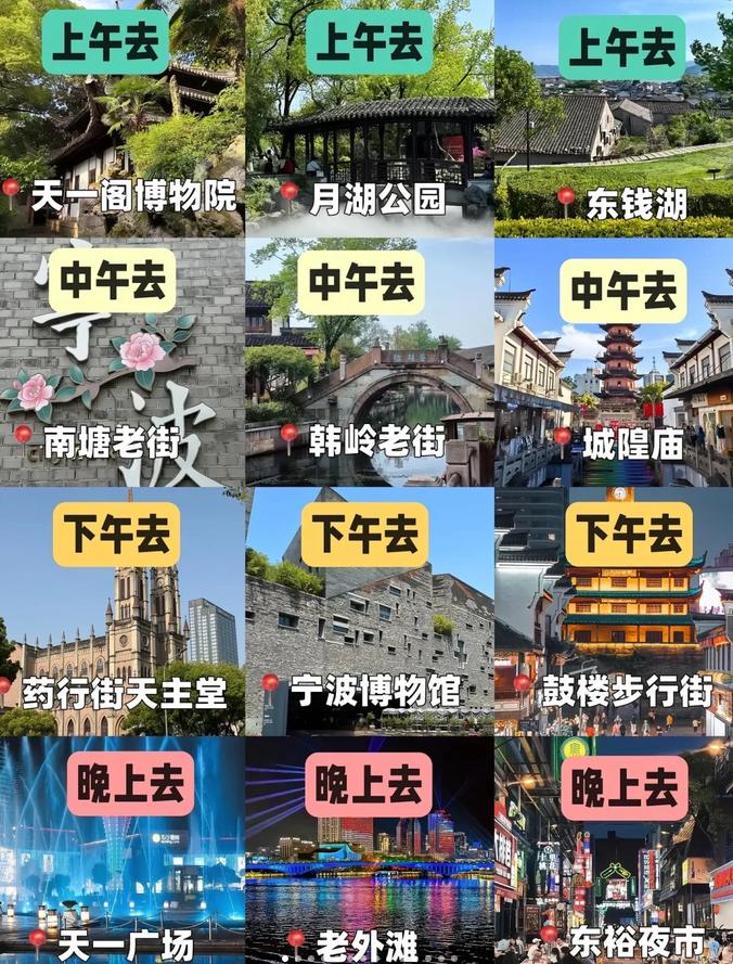 第一天:宁波站→南塘老街→天一阁博物院→月湖公园→城隍庙→药行街天主堂→天一广场→鼓楼→鼓楼步行街→老外滩。