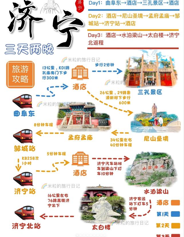 ▶️第三天:酒店出发→(乘坐班车前往济宁汽车站,然后打车约10分钟)水泊梁山→(在济宁客运站打车约5分钟)太白楼→(大约16公里,乘坐76路高铁至济宁北)返回济宁北