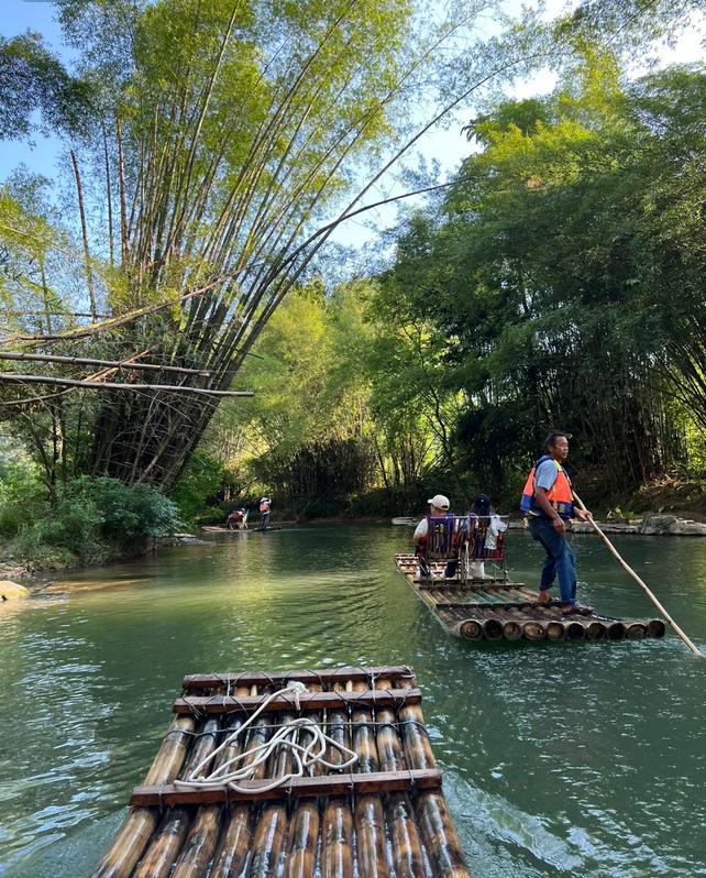 用餐后打车前往民宿,楼下租了一辆电动车🛵出去游玩(30元一天)。前一天我已经预定了水厄底码头四点的竹筏漂流,骑车去水厄底码头大约花了20分钟。竹筏漂流从水厄底码头到工农桥码头,网上说大约需要40多分钟的路程?可能由于人少,或者我们的师傅年轻力壮,大约25分钟左右就到达了。 感觉坐了一会儿拍了几张照片就到达,200元的费用有些不太划算。 不过风景确实很美,真是好山好水⛰️